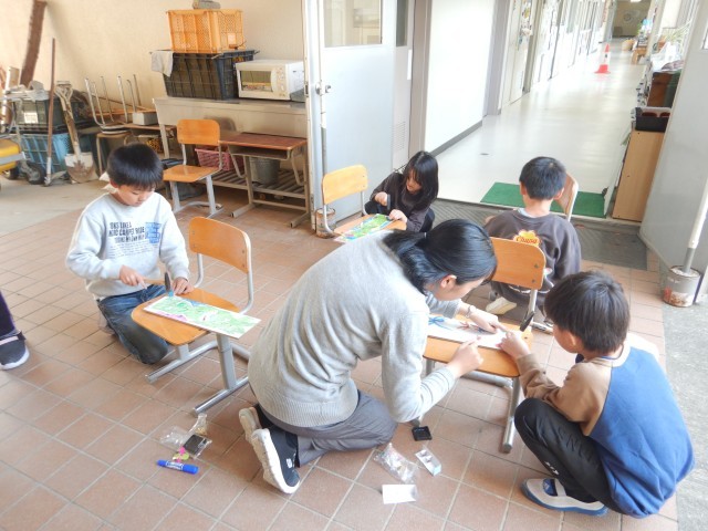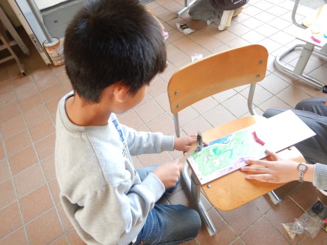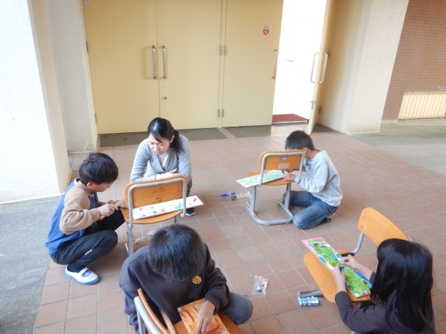 長方形の板にイラスト書き、釘を打つ場所に印をつけました。安全に気をつけながら、トンカチで釘を打ちました。釘の間に、ビー玉を転がして遊ぶゲームボードです。出来上がって遊ぶのが楽しみです。