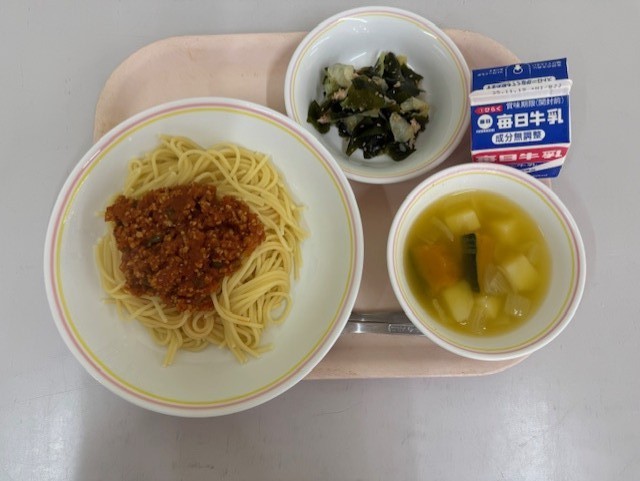 11月10日(月)の献立は、ミートビーンズスパゲッティ、牛乳、ツナとわかめのサラダ、かぼちゃとじゃがいものスープ です。