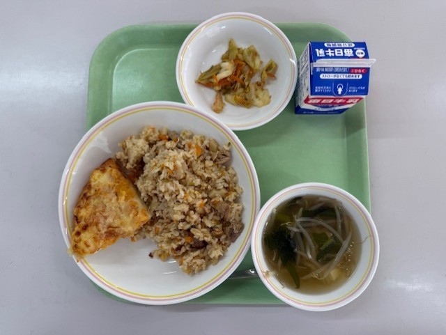 11月13日(木)の献立は、焼き飯、牛乳、キャベツの甘酢炒め、豆腐ともやしのスープ、柿ピザ です。
