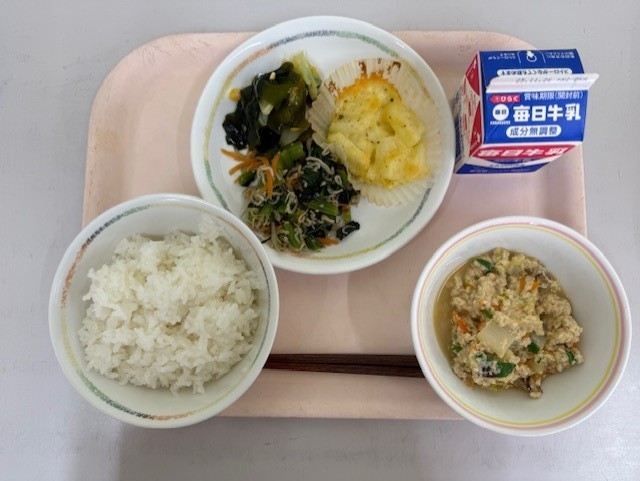 11月17日(月)の献立は、ごはん、牛乳、豆腐の粉の煮物、わかめとコーンの酢の物、じゃことこまつなの炒めもの、チーズポテトです。
