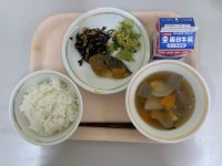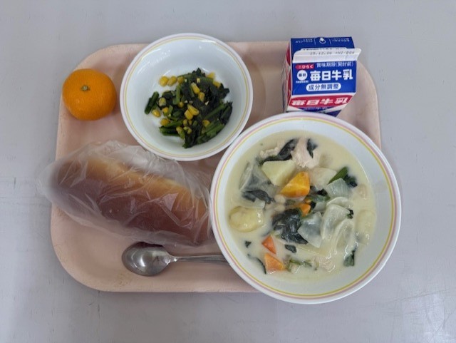 11月26日(水)の献立は、金芽米パン、牛乳、クリームシチュー、こまつなとコーンのオリーブオイル炒め、みかん です。