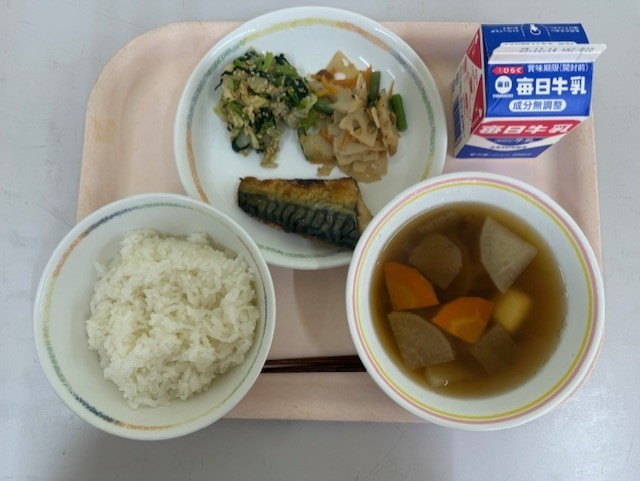 12月4日(木)の献立は、ごはん、牛乳、さばの塩焼き、はくさいとこまつなのごま酢あえ、れんこんの金平、のっぺい汁 です。