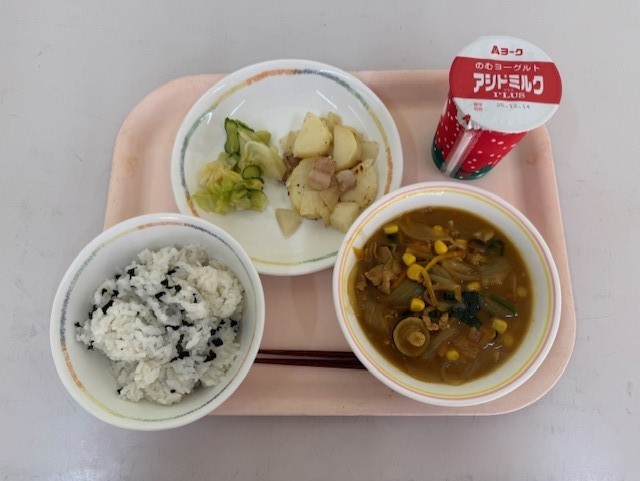 12月5日(金)の献立は、わかめごはん、飲むヨーグルト、カレーヌードル、ジャーマンポテト、グリーンサラダ です。