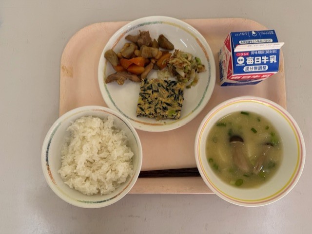 12月10日(水)の献立は、ごはん、牛乳、五目卵焼き、筑前煮、はくさいの梅おかかあえ、すいとん入りみそ汁 です。
