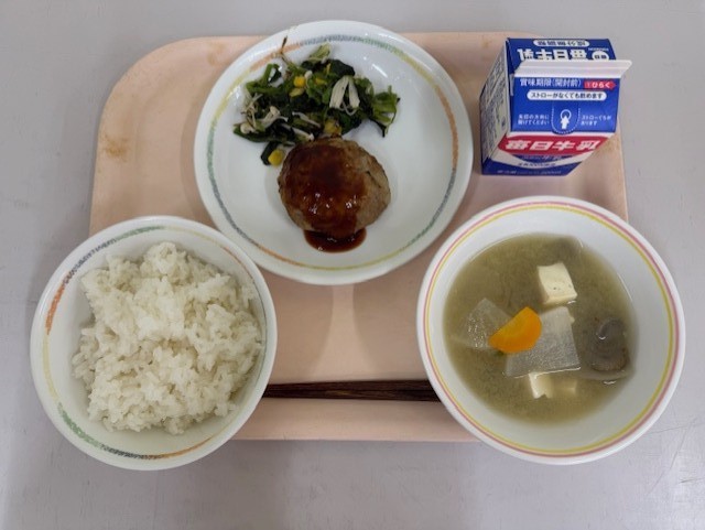 12月15日(月)の献立は、ごはん、牛乳、手づくりハンバーグ、ほうれんそうとえのきのソテー、豆腐と根菜のみそ汁 です。