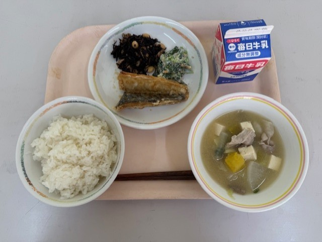 12月19日(金)の献立は、ごはん、牛乳、さばの香り揚げ、こまつなのごまマヨネーズサラダ、ひじきの煮物、豚汁 です。