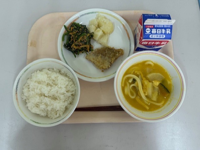 12月22日(月)の献立は、ごはん、牛乳、白身魚のゆずじょうゆがけ、ほうれんそうのごまあえ、粉ふきいも、ほうとう です。今日は、冬至の日の献立です。