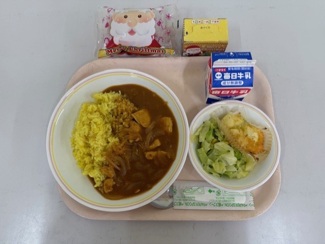12月24日(水)の献立は、ターメリックライスのチキンカレー、牛乳、イタリアンサラダ、チーズポテト、クリスマスセレクトデザート(チョコケーキ・いちごモンブラン)です。今日は、クリスマスの献立でした。