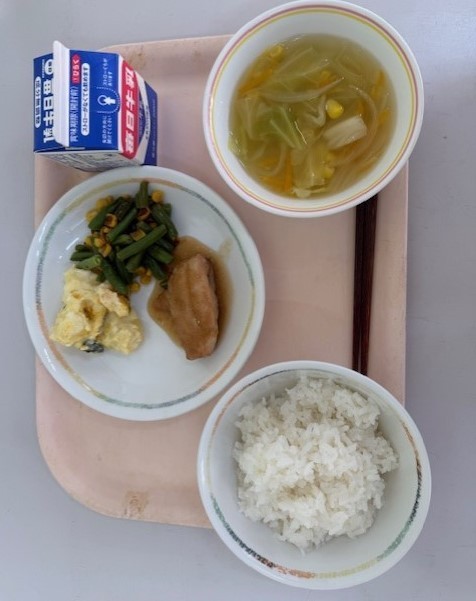 1月23日(金)の献立は、ごはん、牛乳、鶏肉のシャリアピンソース、さやいんげんのバターソテー、かぼちゃ入りサラダ、コンソメスープ です。
