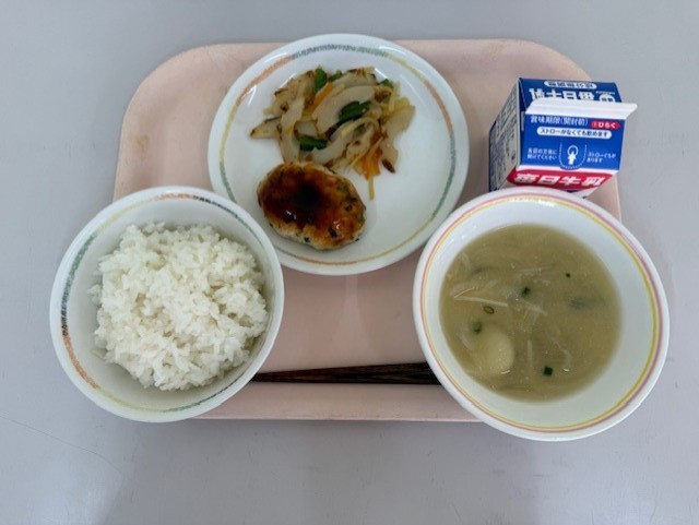 2月18日(水)の献立は、ごはん、牛乳、豆腐ハンバーグ、かわりきんぴら、すいとん入りみそ汁 です。豆腐ハンバーグは、調理員さんがひとつずつ手作りしてつくっています。