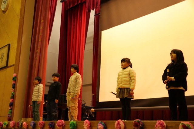 1・2年生は音読劇「たぬきの糸車」。かわいらしい動きと力強い音読で、物語の世界を生き生きと表現しました。