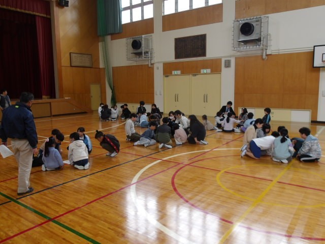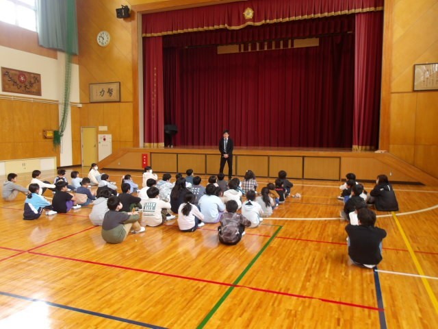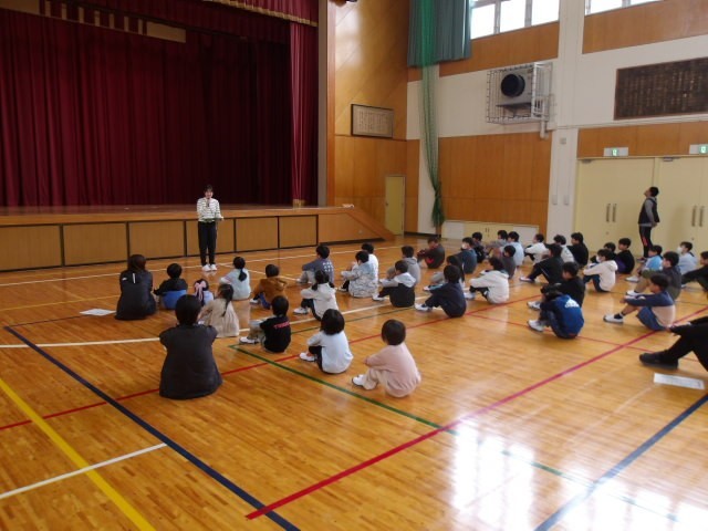 2限目に集会を行いました。給食についてや検診の注意事項、縦割り班や外遊びのルールについてなど先生方から話がありました。全員が顔をあげて先生を見て、話を聞いている姿がありました。