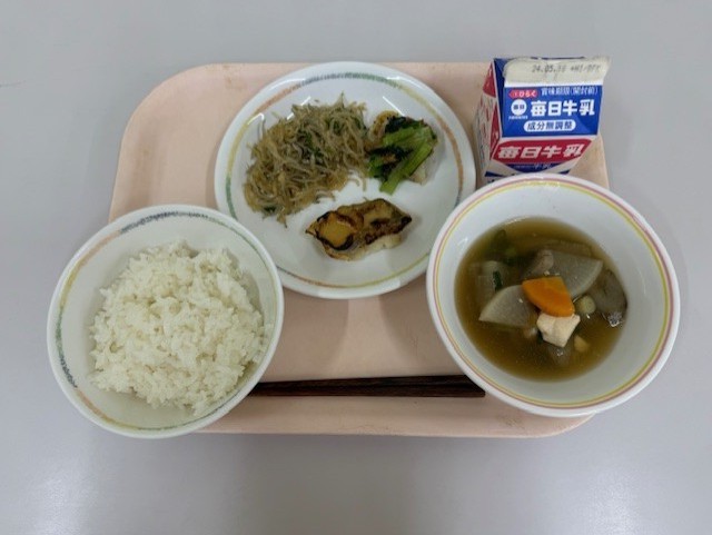 4月10日(金)の献立は、ごはん、牛乳、白身魚の味噌マヨ焼き、はくさいとこまつなの梅おかかあえ、こんにゃく金平、けんちん汁です。