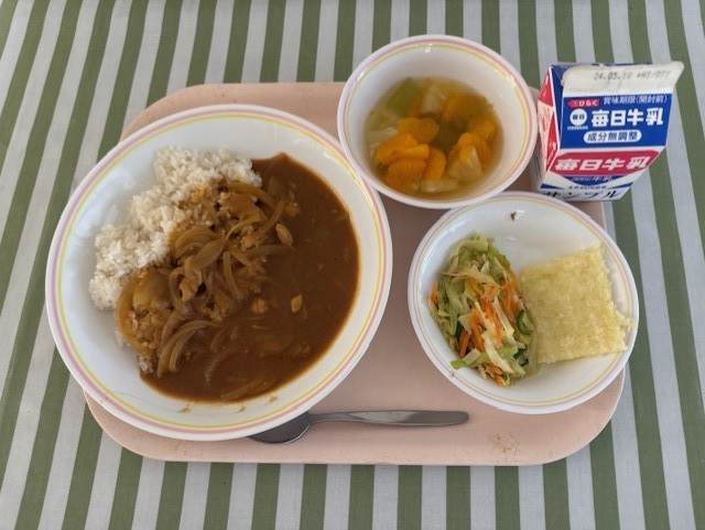 今日の献立は、チキンカレー、牛乳、ツナと野菜の炒め物、ハッシュドポテト、クラッシュゼリーです。今日は、入学・進級お祝い献立でした。1年生は今日から給食が始まります。