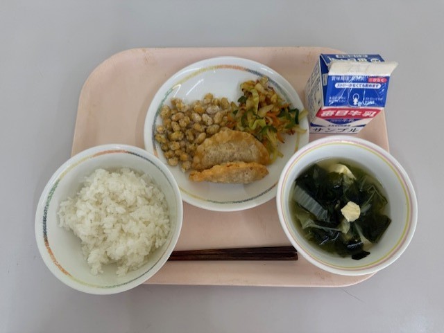 4月20日(月)の献立は、ごはん、牛乳、揚げぎょうざ、あおのりビーンズ、野菜のカレーソテー、わかめスープ です。揚げぎょうざは、調理員さんがひとつずつ包んで揚げてくれました。