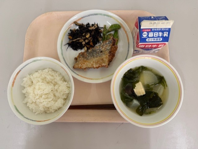 4月27日(月)の献立は、ごはん、牛乳、さわらの香り揚げ、スナップえんどうのごまあえ、ひじきの煮物、じゃがいもとたまねぎのみそ汁 です。