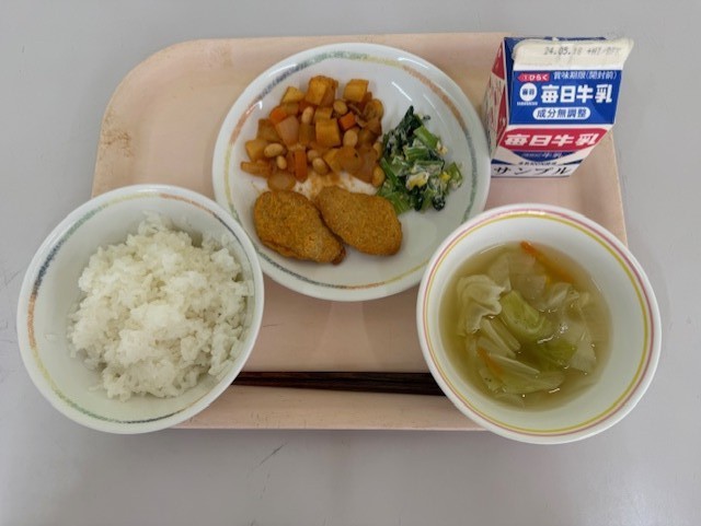4月28日(火)の献立は、ごはん、牛乳、チキンナゲット、こまつなのごまマヨネーズサラダ、ポークビーンズ、春キャベツのコンソメスープ です。