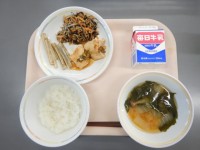 10月3日の献立は、ご飯、牛乳、小松菜入りカレー肉じゃが、みずなとはくさいの酢みそあえ、もずくチャプチェ、煮豆、手作りふりかけです。