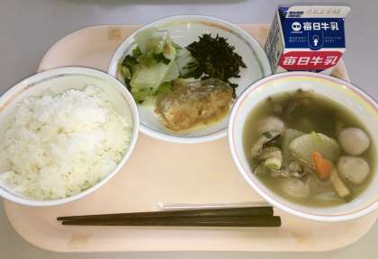 14日の献立は、ご飯・牛乳・たらのごまみそだれ・炒め野菜・ひじきの煮物・のっぺい汁です。