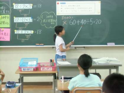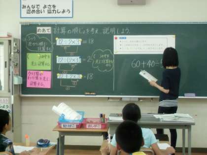 「計算の順序を考え、説明しよう」の学習です。誤った計算を示して、計算の順序の決まりを使って説明し、正しい答えを導く授業を行いました。