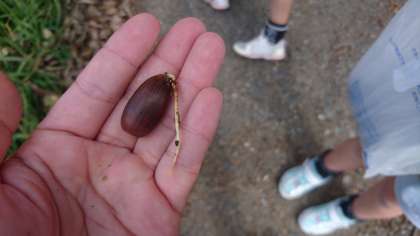 さて、どんぐりを拾っていると、すでに根が伸びはじめているものがあります。