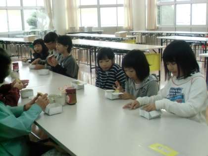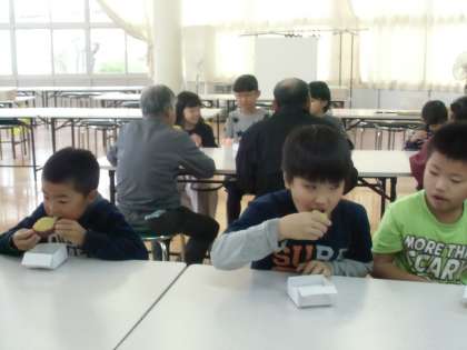 学習発表の後、学校園で育てたふかした「さつまいも」を食べました。