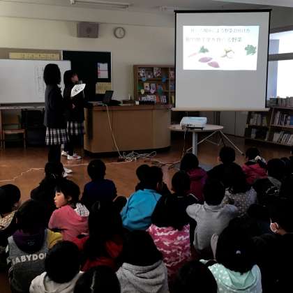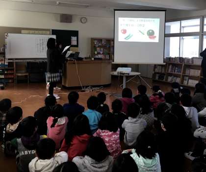 給食の前に図書室で、生徒さん達から野菜のお話を聞きました。