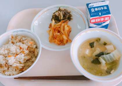 15日の献立は、五目炊き込みご飯・牛乳・かき揚げ・もずくチャプチェ・豆腐とはくさいのみそ汁です。