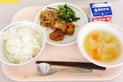 13日の献立は、ご飯・牛乳・豚肉のバーベキューソース・こまつなのごまサラダ・もやし炒め・ポテトスープです。