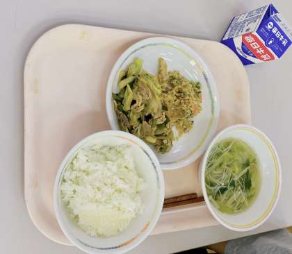 11日の献立は、ご飯・牛乳・豚キムチ炒め・いり卯の花・ビーフンスープです。
