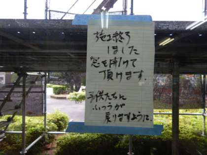 そして今朝、職員室の窓を見ると施工業者の方からの張り紙がありました。そこには、