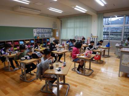 食事の前に、栄養教諭や給食委員さんから食べ物に関するお話を聴かせてもらいます。