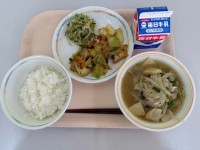 5月14日(水)の献立は、ごはん、牛乳、小松菜入りカレー肉じゃが、はりはりづけ、いり卯の花、手作りふりかけ です。