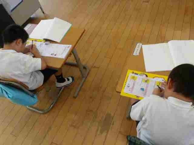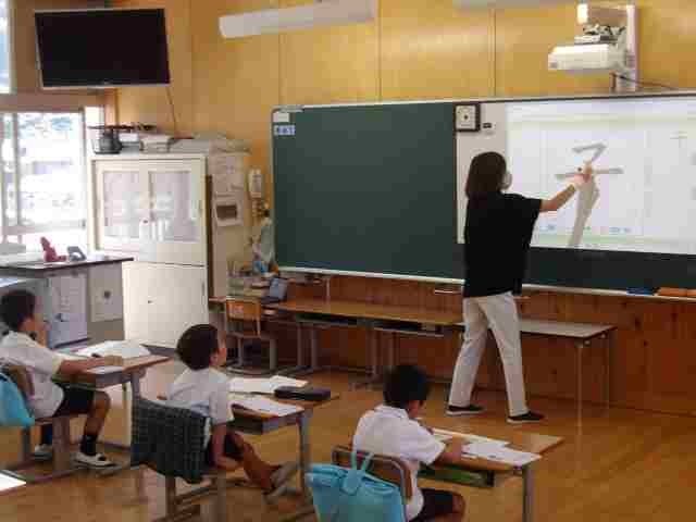 1年生が国語の授業で、漢字の学習をしました。子供の「子」の字の2画目の膨らみを意識して、書く練習をしました。