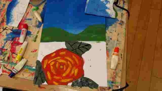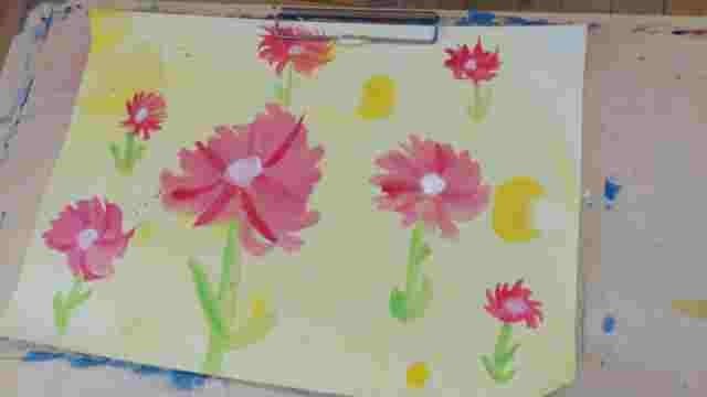 4年生が「だれも見たことのない、まぼろしの花をかこう」をめあてに、下書きをせず花を描きました。自分が想像した花を筆だけでなく、ローラーやスポンジ、ビー玉など身の回りのいろいろな道具を活用して絵を描きました。
