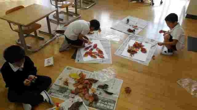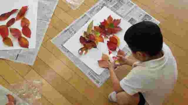 1年生が赤や黄色に色づいた落ち葉の中から、色づきがきれいなものや、不思議な形をしているものを集めました。その後、「なにができるかな」を考えながら、画用紙に落ち葉を貼り合わせました。完成が楽しみです。