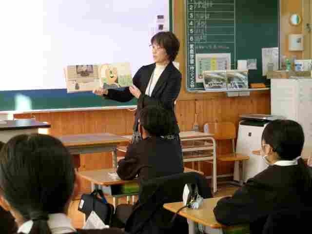 5年生が朝学の時間に、かつらぎ町読書活動推進事業の取組として、読み聞かせをしていただきました。「かえるをのんだ ととさん」という民話のおもしろさに聞き入りました。
