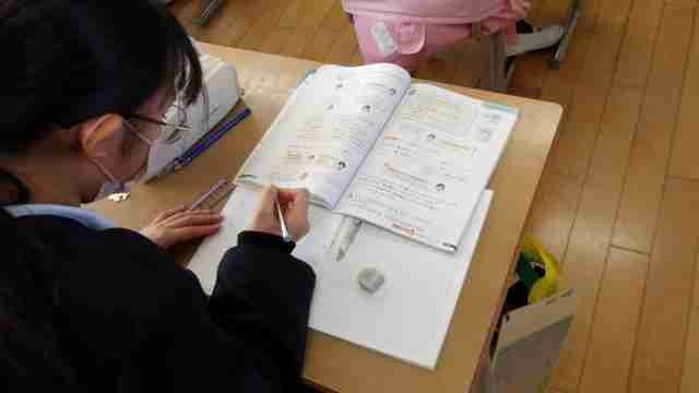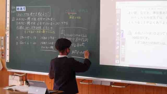 5年生が算数の授業で、「コピーできる速さを考えよう」をめあてに学習しました。2つの異なるコピー機が1分間あたり、何枚コピーできるかを比較することで、どちらがどれくらい速くコピーできるかを求めることができました。