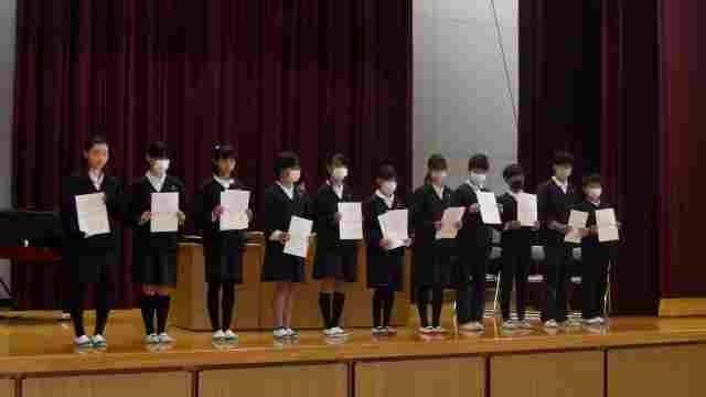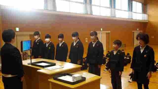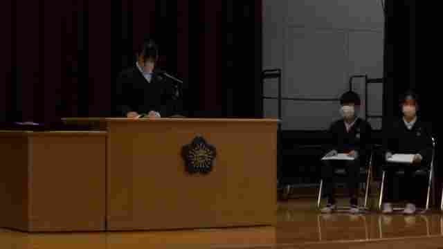 その後、表彰伝達が行われました。その中で、読書感想文コンクールで特選に選ばれた3名が、作品を紹介しました。また、保健委員会から冬休みの過ごし方の注意点などが発表されました。最後に、生徒指導の先生から、冬休みの過ごし方について3つの注意点がありました。自転車に乗車時に注意すること、ゲームやスマホなどは時間を決めること、お金の使い方には気をつけることについて指導がありました。楽しい冬休みになるよう、生活のリズムや危険なことには十分気をつけて過ごしましょう。