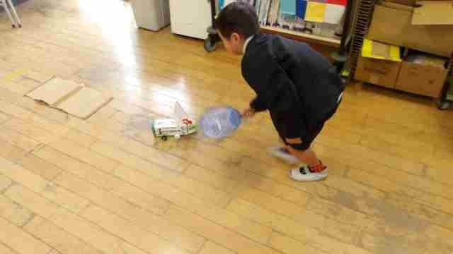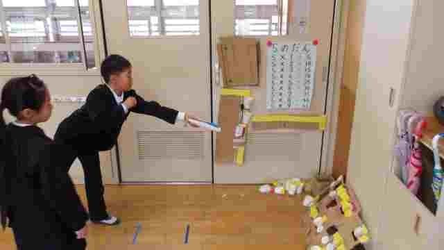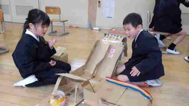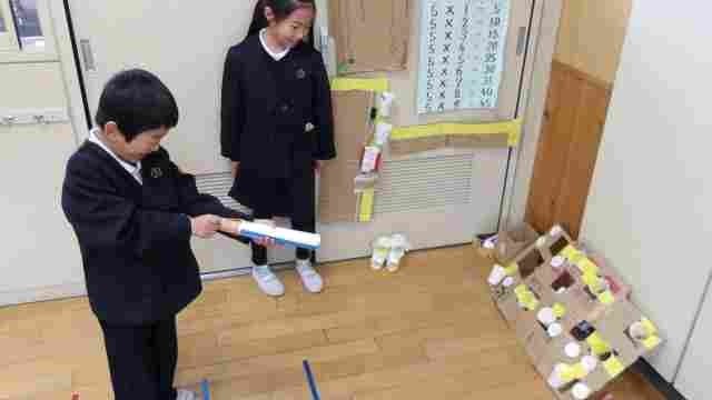 1、2年生が生活科の学習で作ったおもちゃをお互いに紹介し、遊びました。2年生は、うちわの風で動く車や輪ゴムの伸びや捻じれを利用した動くおもちゃで遊びました。1年生は葉やどんぐりなどの秋の贈り物で作ったおもちゃで遊びました。これまでの学習で、おもちゃ作りだけでなくルールを決めたり、景品を作ったりして準備を進めてきたので、みんなが楽しく遊ぶことができました。