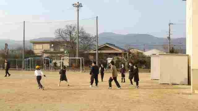 バス待ちの子供たちが、先生と一緒にバレーやサッカーをしていました。