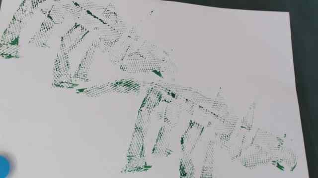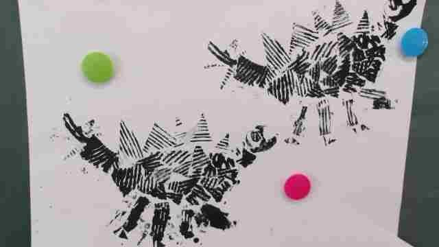 1年生が身近にあるものを活用し、恐竜の世界を版画で表現しました。恐竜の形に切り取り、網目など様々な素材を張り付けることで、個性あふれる恐竜が完成しました。