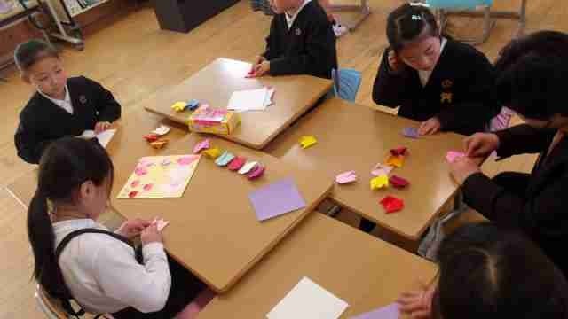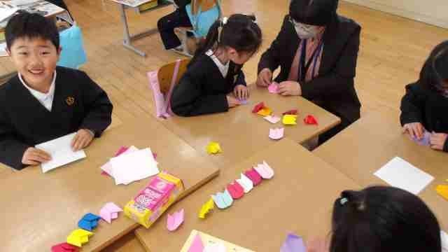 2年生は色紙でチューリップの花を折りました。彩り豊かなチューリップは、6年生を送る会で使われるそうなので、楽しみにしていてくださいね。