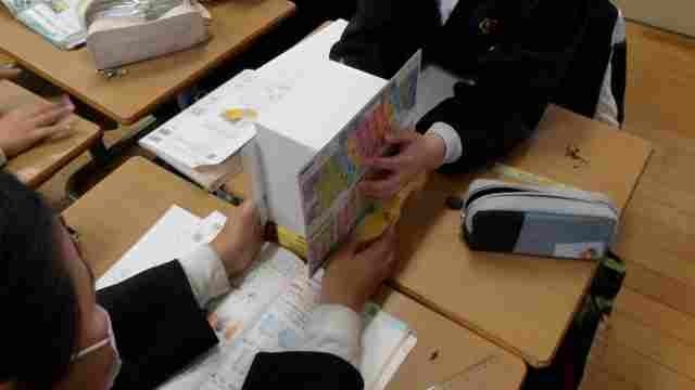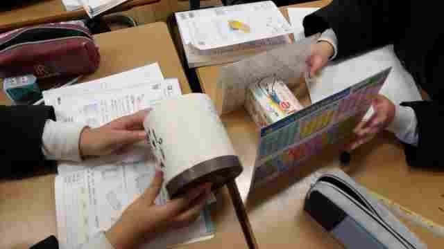 5年生が、面の形に注目して角柱や円柱について学習しました。八角形のお菓子の箱や給食のストローの箱などの様々な角柱を使って、面に下敷きなどを当てながら、面同士の関係を確かめ、平行や垂直の関係に気付くことができました。
