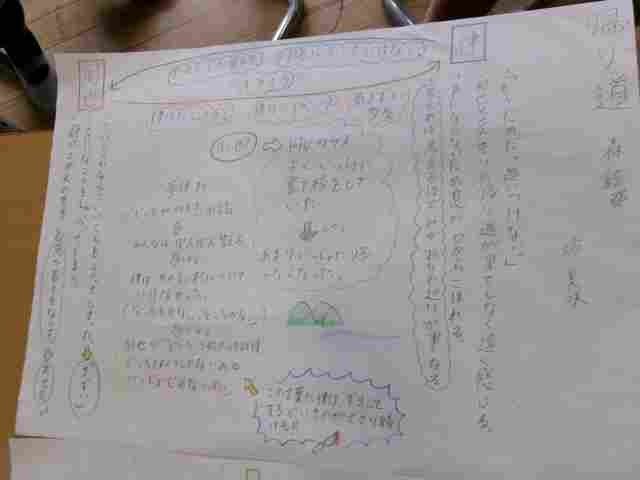 物語「帰り道」を読んで、登場人物の関係や心情ついて、一人一人が読解地図に表しました。同じ物語を読んでも感じ方や考え方の違いがあるため、読解地図に書き込む言葉やまとめ方が違います。今日はそれぞれの読解地図を交流し、友達の考えのよさや工夫に触れて、自分の考えを広げる学習をしました。
