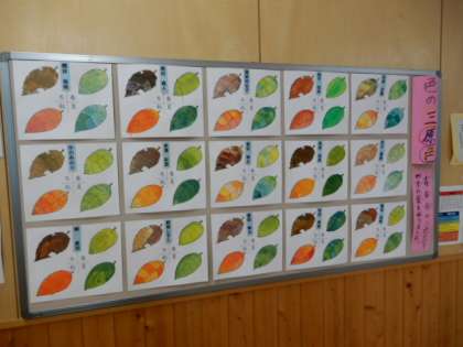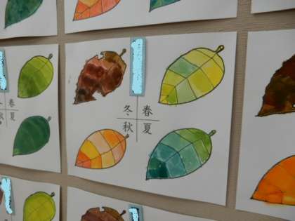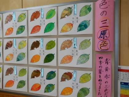 色の3原色(赤・青・黄)だけで四季の葉を塗りました