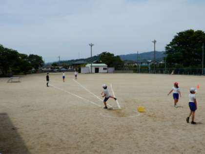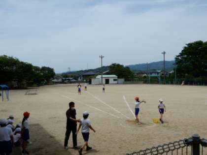 スポーツテストの種目である、ソフトボール投げに挑戦しています。