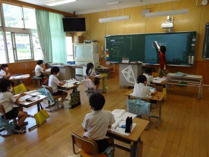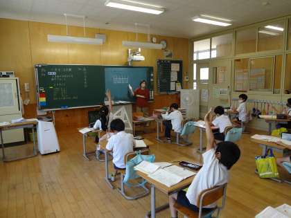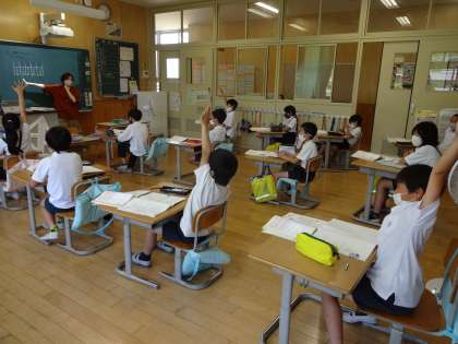 みんなで問題を解いて、発表するときの3年生はとても元気よく手があがっています。