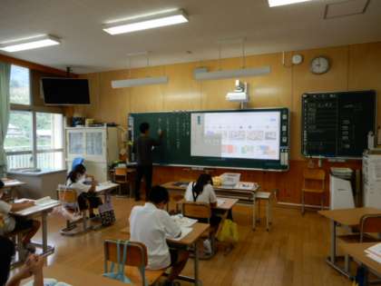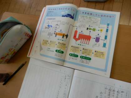 清掃工場のパンフレットを見て、どんな工夫がされているのかをみんなで読み合い、意見を交流しています。