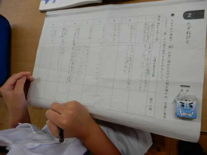 それぞれの場面で、主人公の前にあらわれたものや人物をたしかめ、言葉に着目しながら主人公の心情の変化をまとめています。